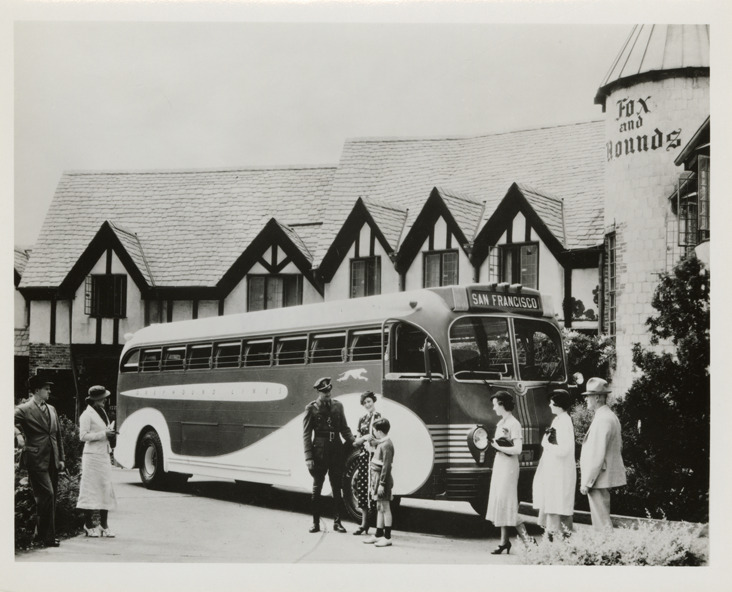 Driver and passengers posing with Greyhound bus in front of Fox and Hounds Restaurant, Bloomfield Hills, Michigan