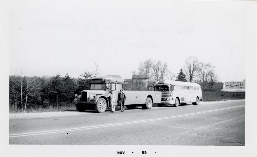 Favorite this☆ Truck towing a Greyhound bus Description: View of two men posing with a truck towing a Greyhound bus. Stamped on front: "Nov 65." Handwritten on back: "Greyhound. We used this for towing about 1944." Details Resource ID: na048688 Subject: Greyhound buses Greyhound Lines, Inc. Wreckers (Vehicles) Photographic prints Date Issued: 1965-11 Format: 1 photographic print ; 3.5 x 5.75 in. Member of: National Automotive History Collection Filing Location: MS121/VanDegrift, Thomas, 11:10 Rights: Physical rights are retained by DPL. Copyright is retained in accordance with U.S. copyright laws.