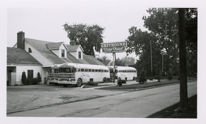 View of Greyhound buses in front of the Effingham Post House in Effingham, Illinois. "Greyhound fine food" sign in background. Typed on back: "Greyhound Lines. Effingham Post House."