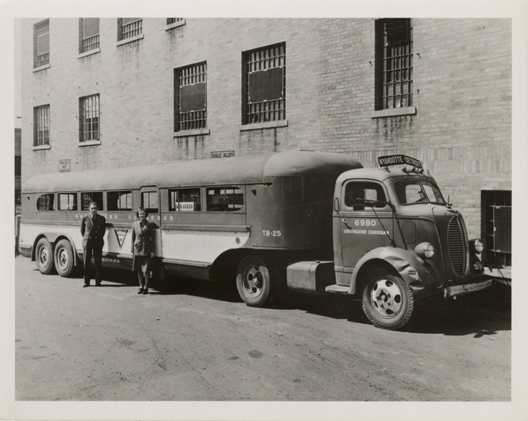 Drivers posing with Greyhound bus, Greyhound Suburban