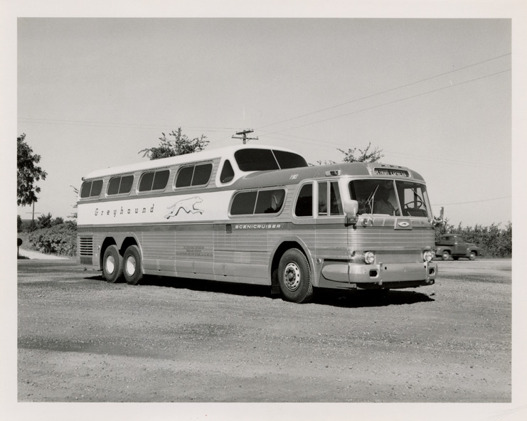 View of a Greyhound Scenicruiser bus. Stamped on back: "Aug 31, 1954." Handwritten on back: "Greyhound."