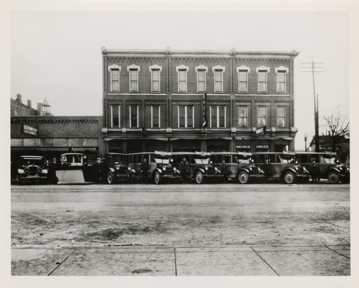 Indian Trails buses parked in front of Hotel Wildermuth, Owosso, Michigan