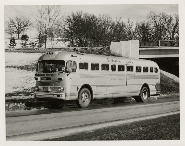 View of a Jefferson Transportation Company bus. Handwritten on back: "Jefferson Transportation."