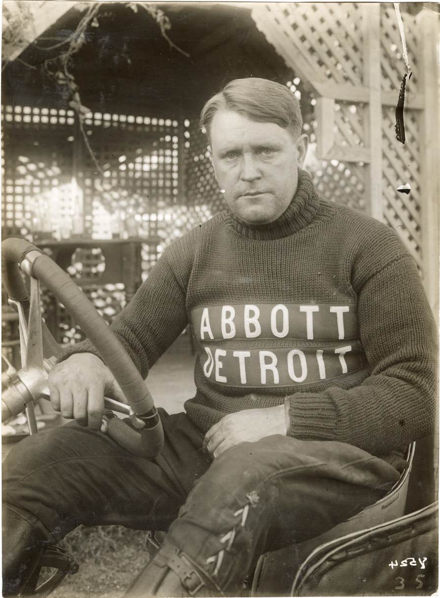 Close-up of a driver Leland A. Mitchell posing in an Abbott-Detroit racecar. Mitchell wears an "Abbott Detroit" sweater. Stamped on back: "Spooner & Wells, Inc., photographers, telephones 3472-3473 Columbus, 1931 Broadway, New York." Handwritten on back: "1911-12." Original is reversed.