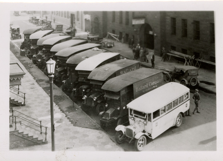 Overhead view of Jefferson Transportation Company buses. Handwritten on back: "Jefferson Transportation."