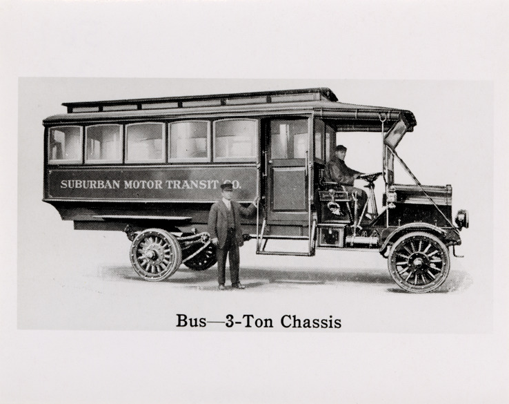 Artist's depiction of a driver and conductor posing with a Kissel bus. Printed on front: "Bus, 3-ton chassis." Handwritten on back: "Kissel Kar."
