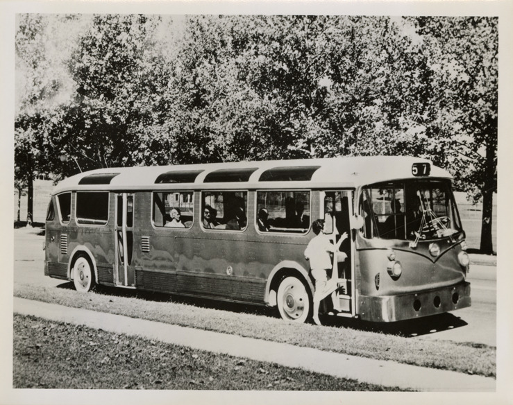 View of a Mack ADS-1 Bus of Tomorrow. Handwritten on back: "Mack ADS, Sep. 1956. Bus of Tomorrow. Hand tooled & designed by Alex DeSakhnoffsky. Displayed at ATA convention."