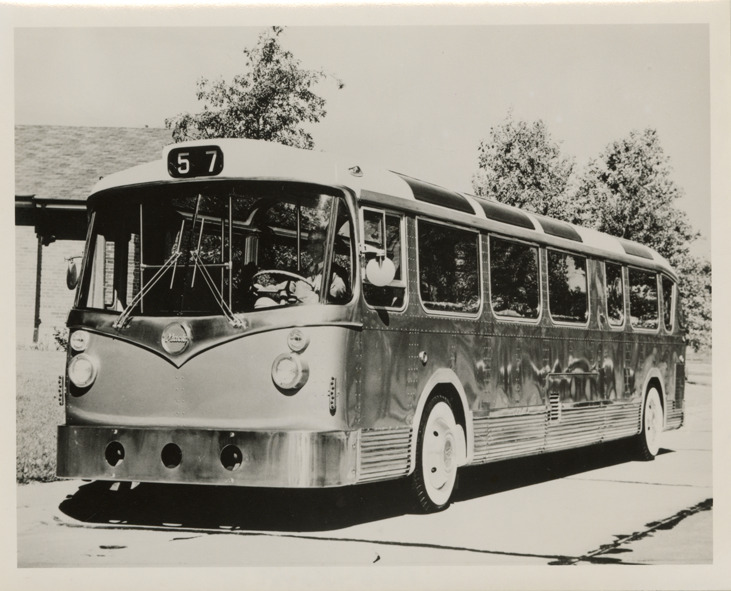 View of a Mack ADS-1 Bus of Tomorrow. Handwritten on back: "Mack ADS. Bus of Tomorrow. Hand tooled & designed by Alex DeSakhnoffsky. Displayed at ATA convention, Sep. 1956."