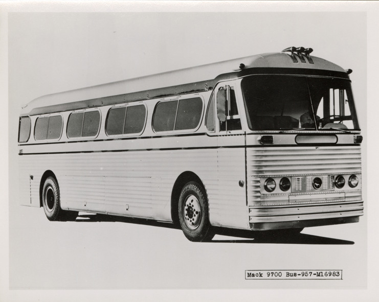 Favorite this☆ Mack 9700 bus Description: View of a Mack 9700 bus. Handwritten on back: "Mack 9700. Inter City demo. Sold to: Clyde's Charter. Sep. 1957. Only one blt. Note windshield like DH-1040 series." Details Resource ID: na048853 Subject: Buses Mack Trucks, Inc. Photographic prints Date Issued: 1957-09 Format: 1 photographic print ; 4 x 5 in. Member of: National Automotive History Collection Filing Location: MS121/VanDegrift, Thomas, 12:11 Rights: Physical rights are retained by DPL. Copyright is retained in accordance with U.S. copyright laws.