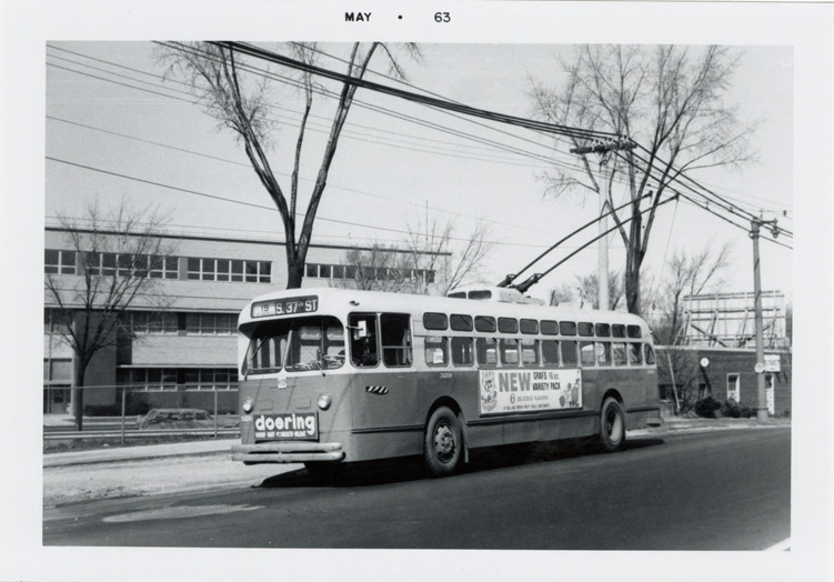 View of a Marmon-Herrington trolley bus for the Milwaukee & Suburban Transport. Printed on front: "May 63." Handwritten on back: "Marmon-Herrington. Milwaukee & Suburban Transport, Milwaukee, Wis. April 1963."