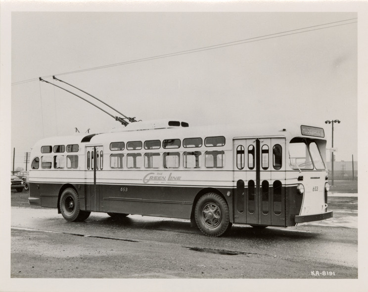 View of a Marmon-Herrington trolley bus. Handwritten on back: "Marmon-Herrington TC."
