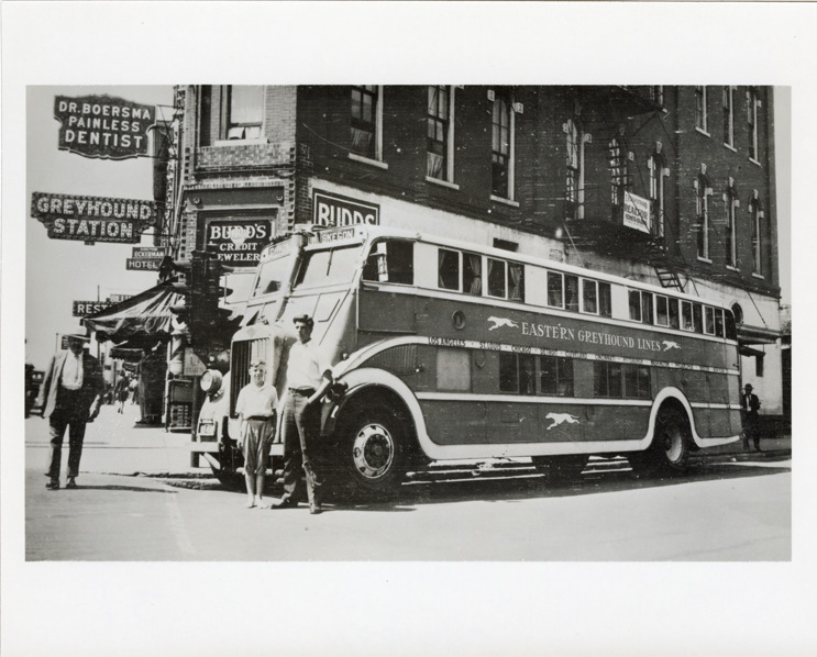 Favorite this☆ Pickwick Stages Duplex bus, Eastern Greyhound Lines, Muskegon, Michigan Description: View of a man and boy posing with a Pickwick Stages Duplex bus for the Eastern Greyhound Lines at Muskegon, Michigan. Handwritten on back: "Pickwick Duplex. Eastern Greyhound Lines. Muskegon, MI, 1933." Details Resource ID: na048921 Subject: Buses--Michigan--Muskegon Pickwick Stages Greyhound buses Greyhound Lines, Inc. Photographic prints Date Issued: 1933 Format: 1 photographic print ; 4 x 5 in. Member of: National Automotive History Collection Filing Location: MS121/VanDegrift, Thomas, 13:5 Rights: Physical rights are retained by DPL. Copyright is retained in accordance with U.S. copyright laws.