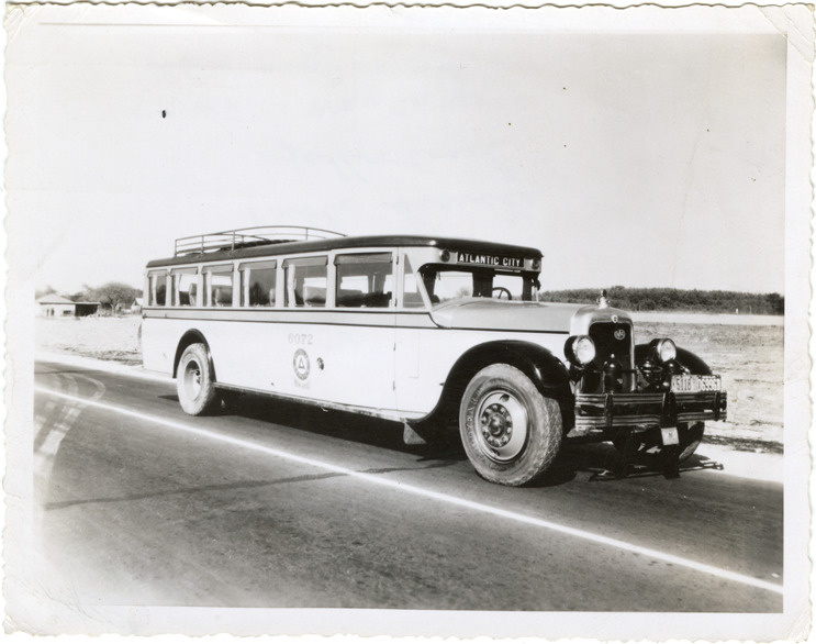 View of a Yellow Coach bus for Public Service Coordinated Transport. Stamped and handwritten on back: "Public Services Coord. Transport. Car no.: 6072. At halfway between Phila. & Atlantic City. Date: 1929. Model: Type Y. Line: Phila. to Atlantic City. Company: Public Service (N.J.) Builder: Yellow Coach. Ex-White Way Tours car. White paint job."