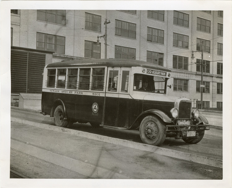 View of a Yellow Coach bus for Public Service Coordinated Transport at Newark, New Jersey. Handwritten on back: "Yellow Coach W. #8101. Public Service Coordinated Transport of NJ. Newark, NJ, 1931."