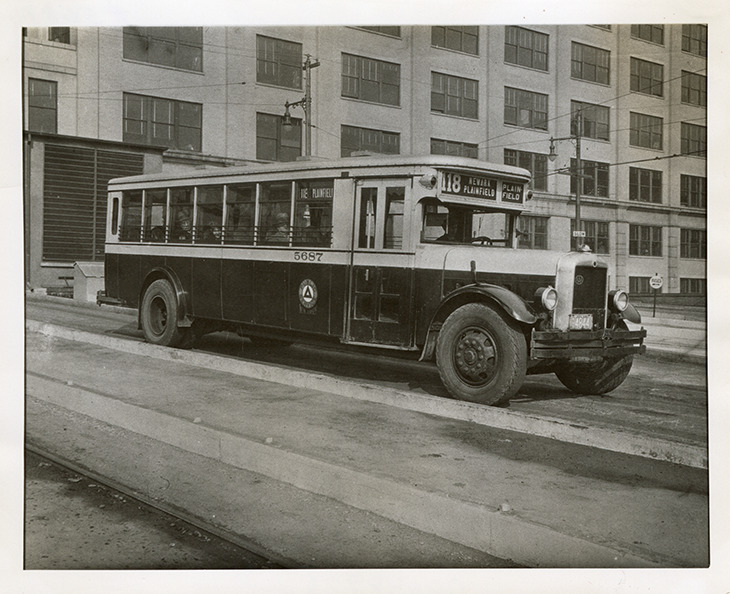 View of a Yellow Coach bus for Public Service Coordinated Transport at Newark, New Jersey. Handwritten on back: "Yellow Coach ZAAAP. #5687. Newark, NJ, 1931. Public Service Coordinated Transport of NJ."
