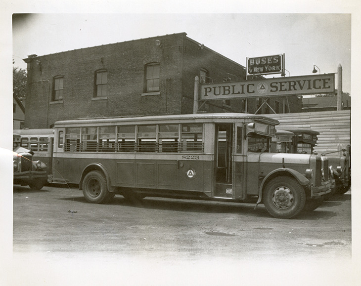 View of a Yellow Coach bus for Public Service Coordinated Transport at Hackensack, New Jersey. Handwritten on back: "Yellow Coach ZAAAQ. #8223. Hackensack, NJ, 1944. Public Service Coordinated Transport of NJ."