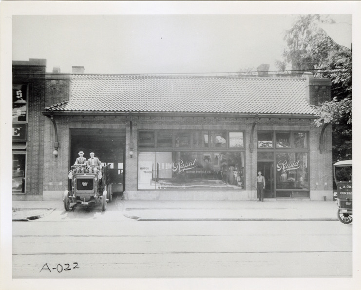 View of motorists posing in a 1911 Rapid truck in front of a Rapid dealership located at 1237-1241 Woodward Ave. in Detroit, Michigan. Handwritten on back: "Rapid retail store, Pontiac [sic, SB Detroit], MI. Rapid 2-ton, 1911. 4 cyl., 45 hp."