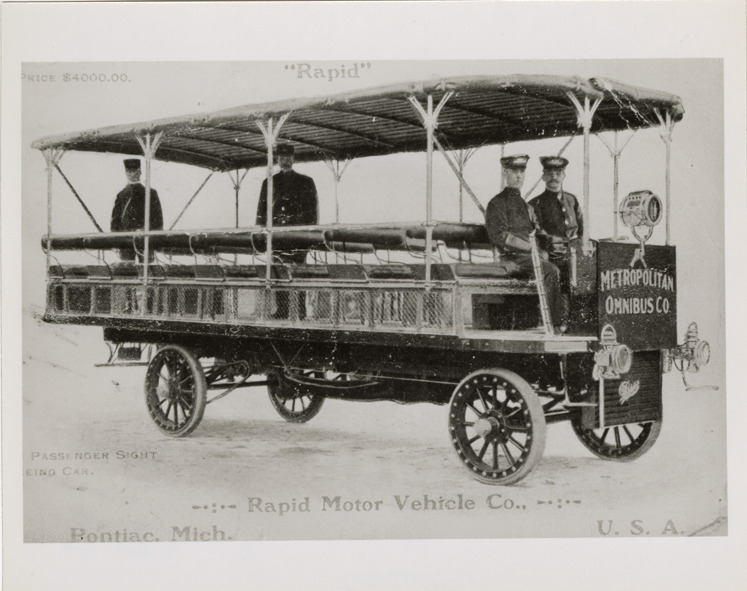 Favorite this☆ Drivers posing with 1907 Rapid sightseeing bus Description: View of drivers posing with a 1907 Rapid sightseeing bus. Printed on front: "Rapid Motor Vehicle Co., Pontiac, Mich. U.S.A." Handwritten on back: "Rapid sightseeing car, 1907. 28 pass." Details Resource ID: na048982 Subject: Buses Rapid Motor Vehicle Company Bus drivers Photographic prints Date Issued: Unknown year Format: 1 photographic print ; 4 x 5 in. Member of: National Automotive History Collection Filing Location: MS121/VanDegrift, Thomas, 13:15 Rights: Physical rights are retained by DPL. Copyright is retained in accordance with U.S. copyright laws.