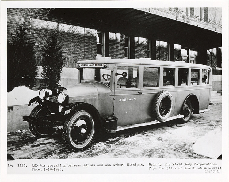 View of a Reo bus. Printed on front: "14. 1925 Reo bus operating between Adrian and Ann Arbor, Michigan. Taken 1-19-1925. Body by the Field Body Corporation. From the files of R.A. Crist." Handwritten on back: "Reo."