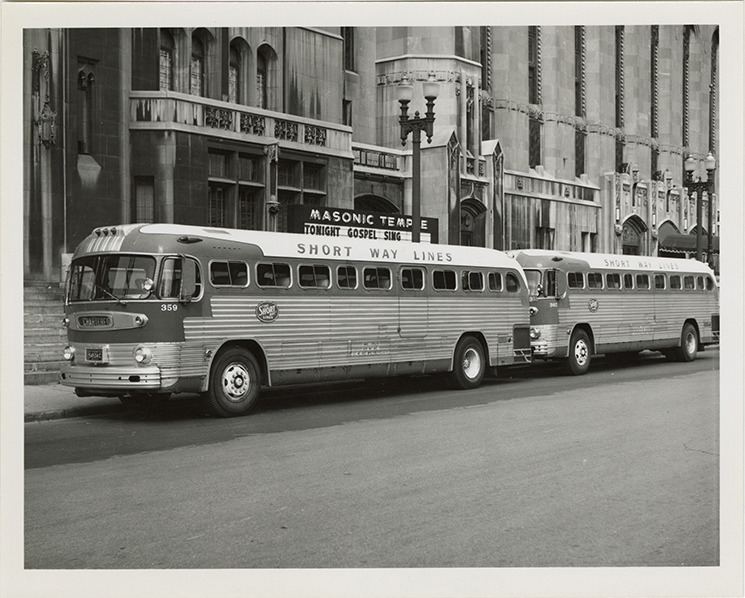 Favorite this☆ Short Way Lines buses Description: View of two Short Way Lines buses parked in front of Masonic Temple. Stamped on back: "Sep. 21, 1963." Handwritten on back: "PD 4103." Details Resource ID: na049020 Subject: Buses Short Way Lines Photographic prints Date Issued: 1963-09-21 Format: 1 photographic print ; 4 x 5 in. Member of: National Automotive History Collection Filing Location: MS121/VanDegrift, Thomas, 14:5 Rights: Physical rights are retained by DPL. Copyright is retained in accordance with U.S. copyright laws.