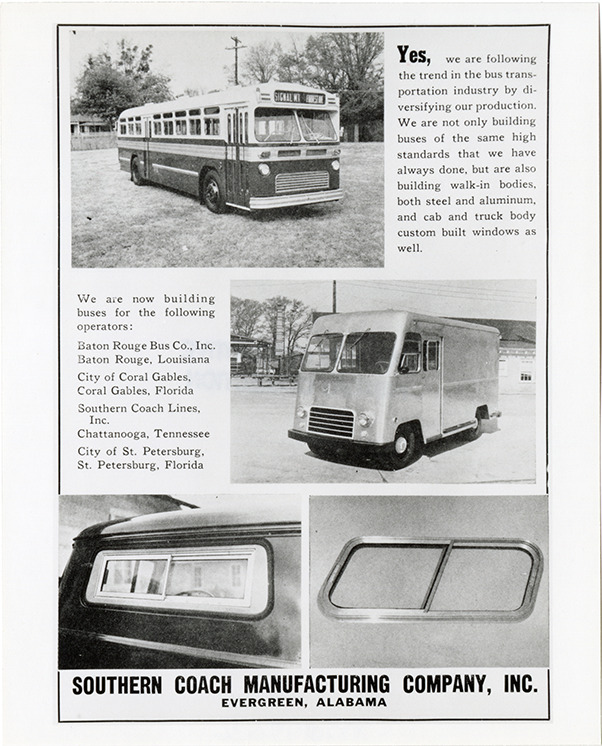 Favorite this☆ Advertisement for Southern Coach buses Description: Advertisement for Southern Coach buses, showing exterior views and close-up views of windows. Printed on front [in part]: Southern Coach Manufacturing Company, Inc. Evergreen, Alabama." Handwritten on back: "Southern Coach." Details Resource ID: na049036 Subject: Buses Buses--Windows and windshields Southern Coach Manufacturing Company Advertising Photographic prints Date Issued: Unknown year Format: 1 photographic print ; 5 x 4 in. Member of: National Automotive History Collection Filing Location: MS121/VanDegrift, Thomas, 14:6 Rights: Physical rights are retained by DPL. Copyright is retained in accordance with U.S. copyright laws.