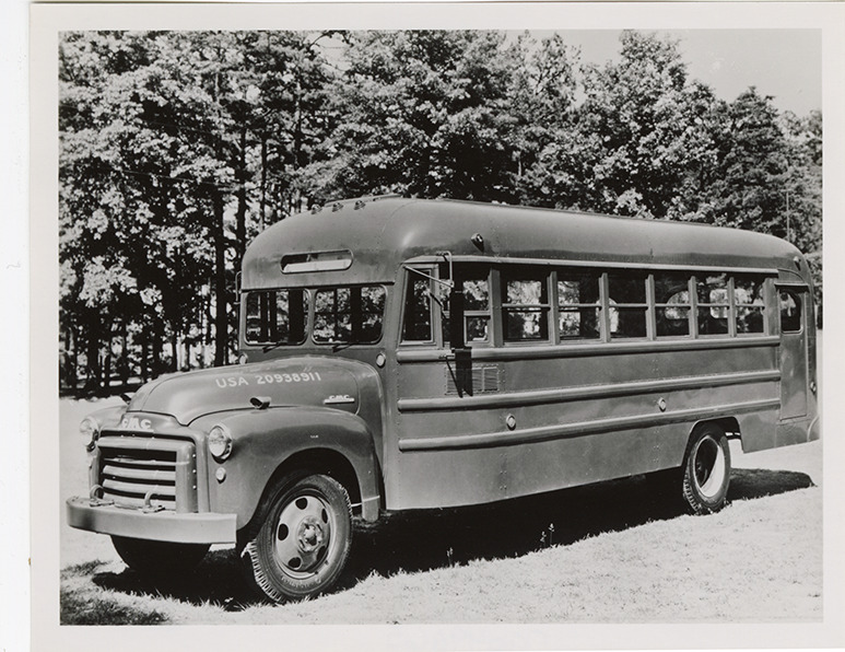 View of a Thomas bus for the U.S. government. Handwritten on back: "Thomas body on GMC front engine hood type chassis as built for U.S. government. Seats approx. 29 passengers."