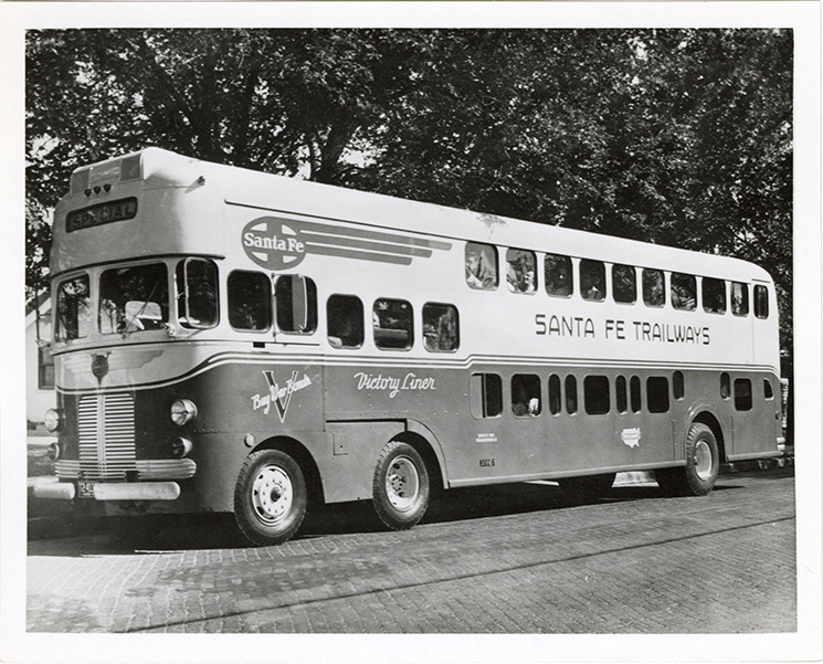 Favorite this☆ Santa Fe Trailways Victory Liner bus Description: View of a Santa Fe Trailways Victory Liner bus. Handwritten on back: "Trailways. V-1800 Victory Liner. 117 pass. Built during WWII at Santa Fe shops used in KS." Details Resource ID: na049071 Subject: Buses Santa Fe Trailways Photographic prints Date Issued: Unknown year Format: 1 photographic print ; 4 x 5 in. Member of: National Automotive History Collection Filing Location: MS121/VanDegrift, Thomas, 14:14 Rights: Physical rights are retained by DPL. Copyright is retained in accordance with U.S. copyright laws.