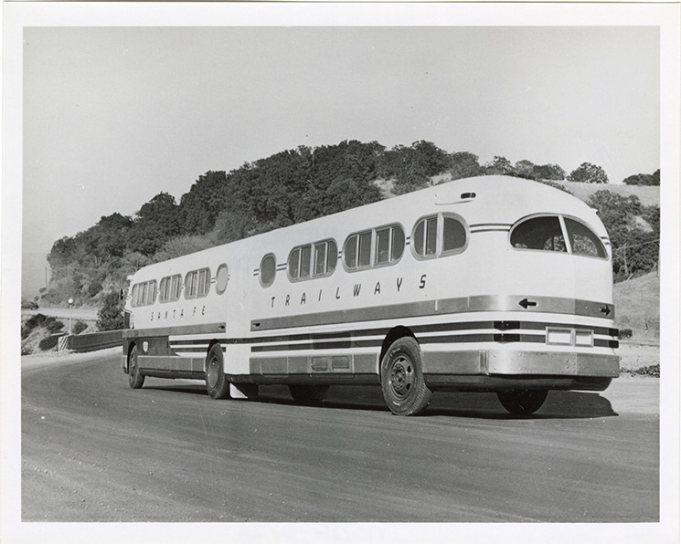 Favorite this☆ Santa Fe Trailways bus Description: View of a Santa Fe Trailways bus. Handwritten on back: "Trailways. Kaiser articulated." Details Resource ID: na049072 Subject: Buses Santa Fe Trailways Photographic prints Date Issued: Unknown year Format: 1 photographic print ; 4 x 5 in. Member of: National Automotive History Collection Filing Location: MS121/VanDegrift, Thomas, 14:14 Rights: Physical rights are retained by DPL. Copyright is retained in accordance with U.S. copyright laws.