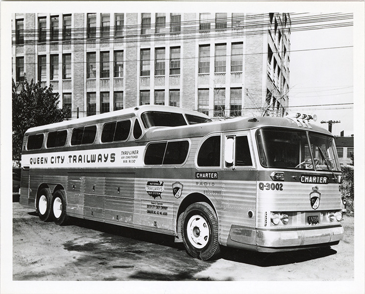 View of a 1963 Queen City Trailways Golden Eagle bus. Handwritten on back: "Trailways. Queen City. Beck. 1963 model Golden Eagle."