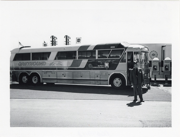 Favorite this☆ Greyhound Turbocruiser III bus, Transpo '72 Description: View of a Greyhound Turbocruiser III bus at Transpo '72. Driver in foreground. Handwritten on back: "6998 Turbocruiser III, Transpo 72, 5-27-72. Isn't Turbocruiser a GM registered name?" Details Resource ID: na049113 Subject: Greyhound buses--Washington (D.C.) Greyhound Lines, Inc. Air Transportation Conference (1972 : Washington, D.C.) Bus drivers--Washington (D.C.) Photographic prints Date Issued: 1972-05-27 Format: 1 photographic print ; 3.5 x 4.75 in. Member of: National Automotive History Collection Filing Location: MS121/VanDegrift, Thomas, 15:1 Rights: Physical rights are retained by DPL. Copyright is retained in accordance with U.S. copyright laws.