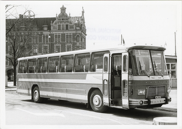 View of a 1969 Volvo bus. Handwritten on back: "No. 130-24A. Volvo/Ikarus B-58, (1969). SJ, no. 1017. Owned by SJ (Swedish Railways). 10 delivered in 1969. Chassis: Volvo B-58, 230 hp. Coachwork: Ikarus, Hungary. SJ is the largest bus company in Sweden (1500 vehicles)."