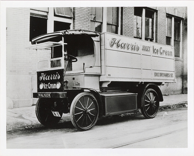 View of a Walker electric truck for Harris "Jersey" ice cream. Handwritten on back: "Walker electric."