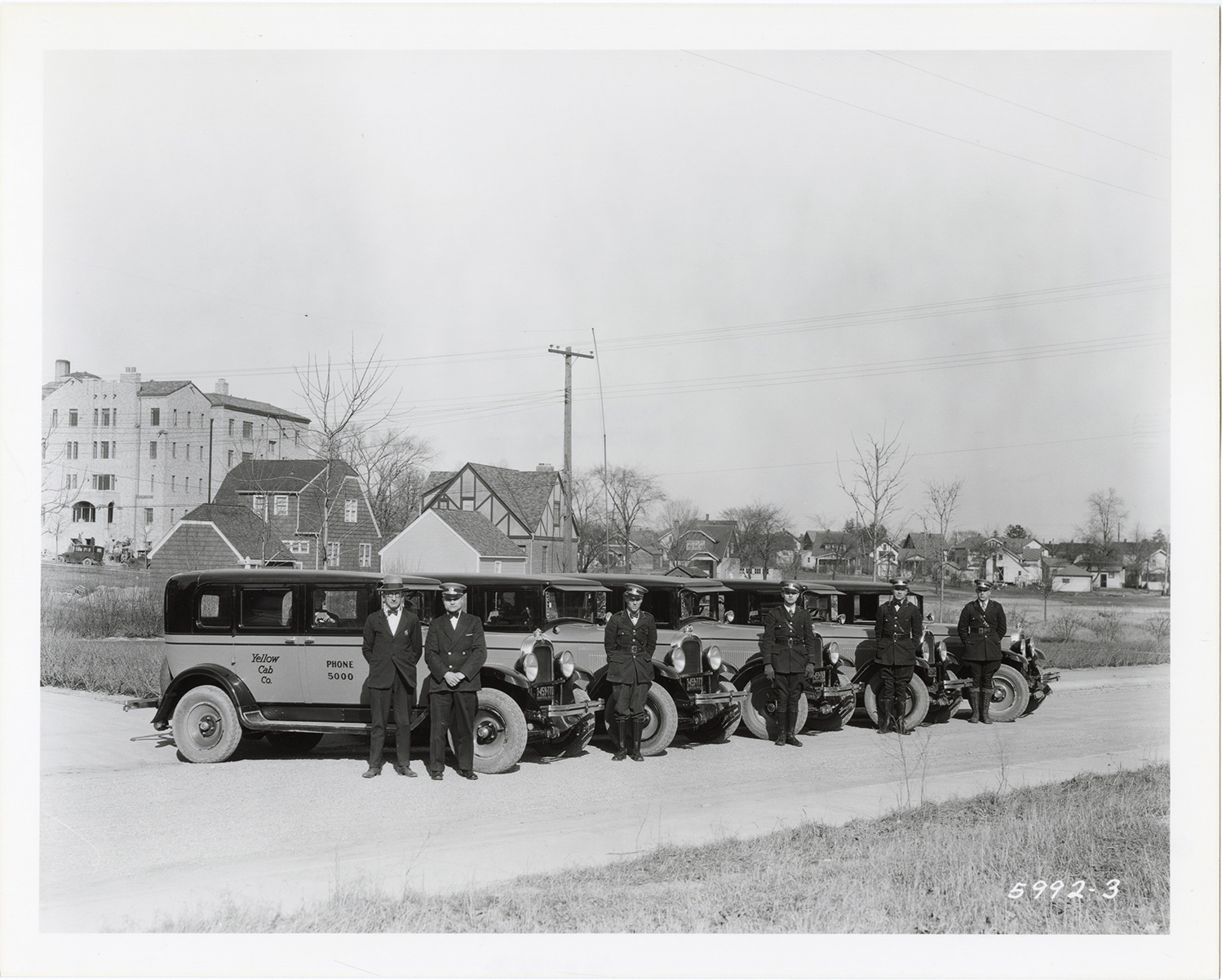 Drivers posing with Yellow Cab taxis, Pontiac, Michigan