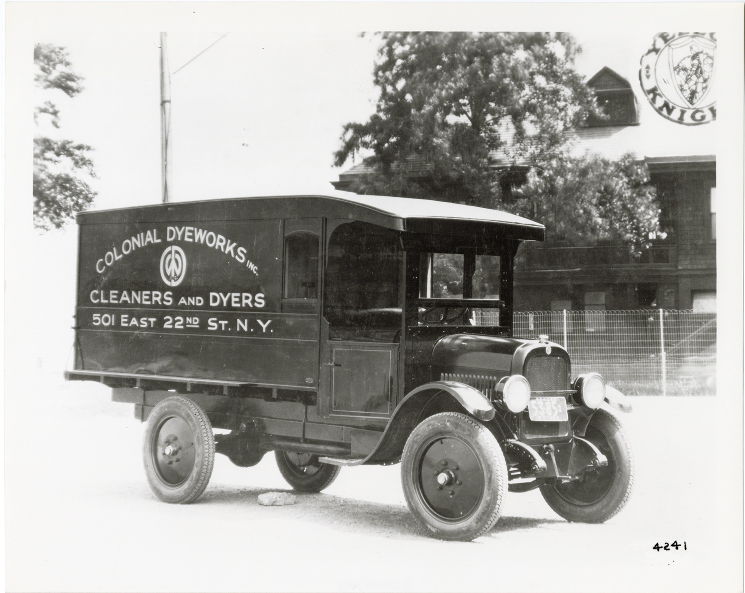 View of a Yellow Knight truck for the Colonial Dyeworks. Painted on side of truck: "Colonial Dyeworks, Inc. cleaners and dyers, 501 East 22nd St., N.Y." Handwritten on back: "Yellow Knight T-2."