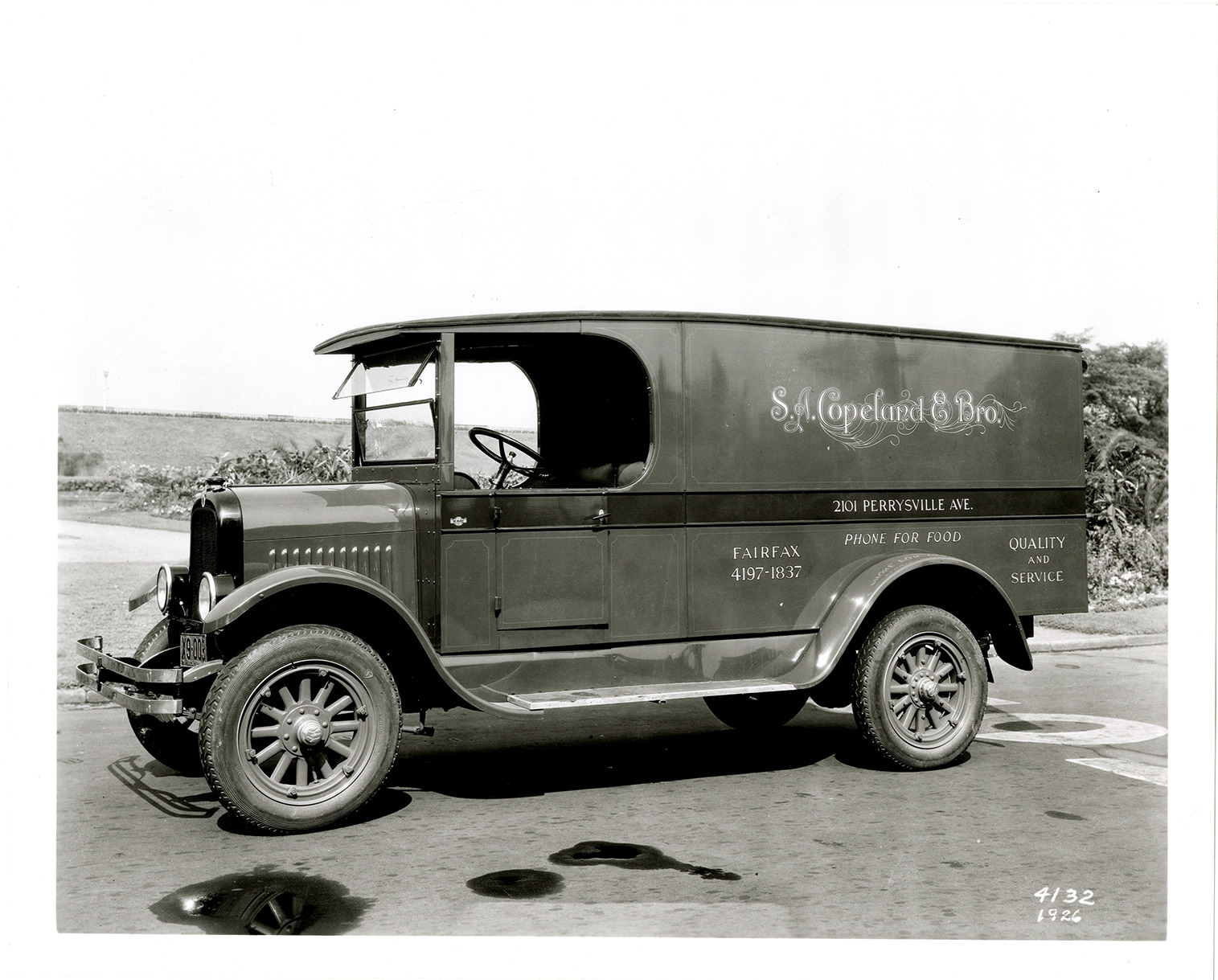View of a Yellow Knight truck for S.A. Copeland & Bro. at Pittsburgh, Pennsylvania. Painted on side of truck: "S.A. Copeland & Bro. 2101 Perrysville Ave. Phone for food. Fairfax 4197-1837. Quality and service." Handwritten on back: "Yellow Knight T-2. Pittsburgh, 1926."