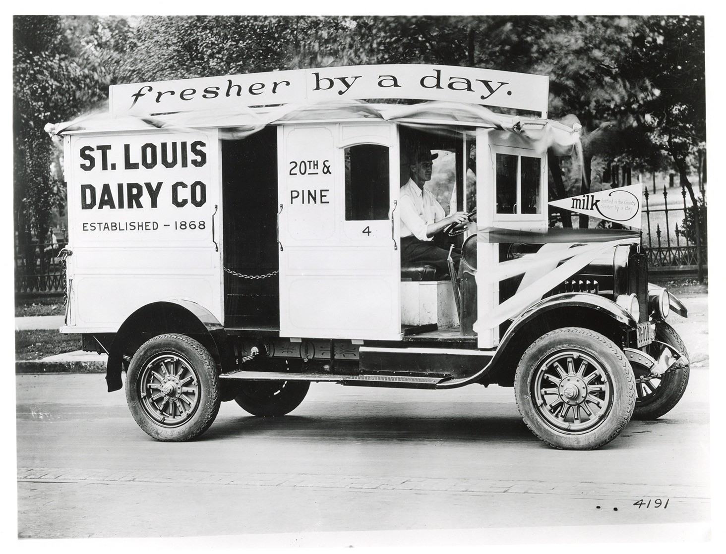 View of a driver posing in a 1926 Yellow Knight truck for the St. Louis Dairy Co. Painted on side of truck: "St. Louis Dairy Co. 20th & Pine. Established 1868. Fresher by a day." Handwritten on back: "Yellow Knight T-2, 1926."