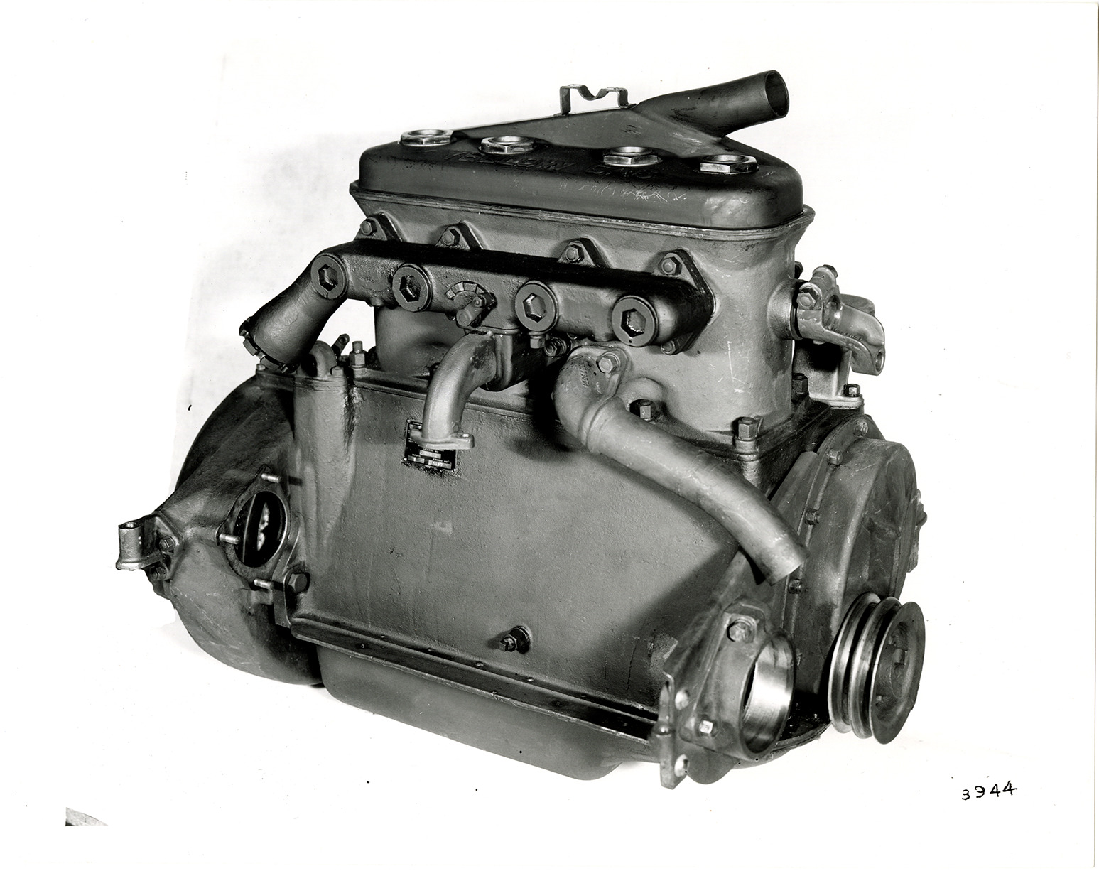 View of a Yellow Sleeve Valve engine for a Yellow Knight truck. Handwritten on back: "Yellow Knight. 2nd Model 'V' sleeve valve eng. for T-2 truck, 1925."