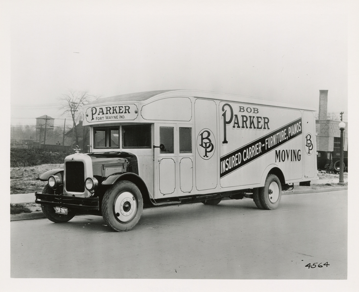 View of a Yellow Truck and Coach truck for Bob Parker Moving. Painted on truck: "Parker, Fort Wayne, Ind. Bob Parker Moving. Insured carrier, furniture, pianos." Handwritten on back: "Yellow Truck & Coach."