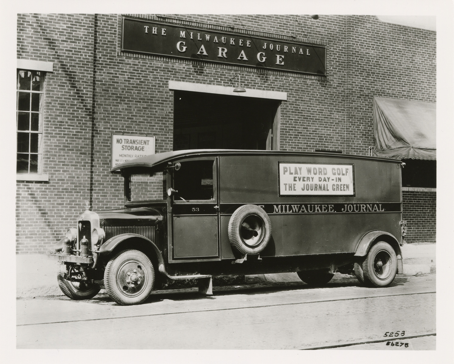 View of a Yellow Truck and Coach truck for the Milwaukee Journal. "The Milwaukee Journal. Play word golf every day in the Journal green" is painted on side of truck. Milwaukee Journal Garage in background. Handwritten on back: "Yellow Truck & Coach. Yellow Coach. Type X. Milwaukee Journal, 1927."