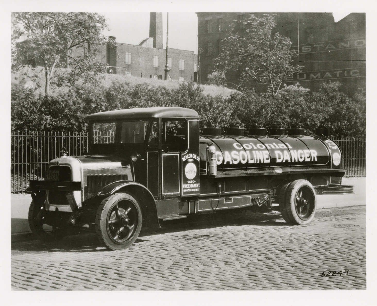 View of a Yellow Truck and Coach truck for the Beacon Oil Co. "Beacon Oil Co., Inc., 320 Freeman St., Brooklyn, N.Y. Colonial gasoline, danger" is painted on side of truck. Handwritten on back: "Yellow Truck & Coach. Yellow Coach. Model K-72-Y. Beacon Oil Co. 1927."
