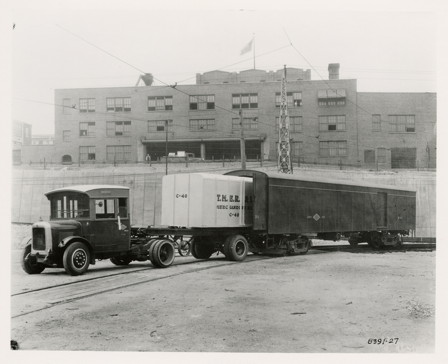 Yellow Truck and Coach truck, T.M.E.R. & L. Co. and railroad freight car