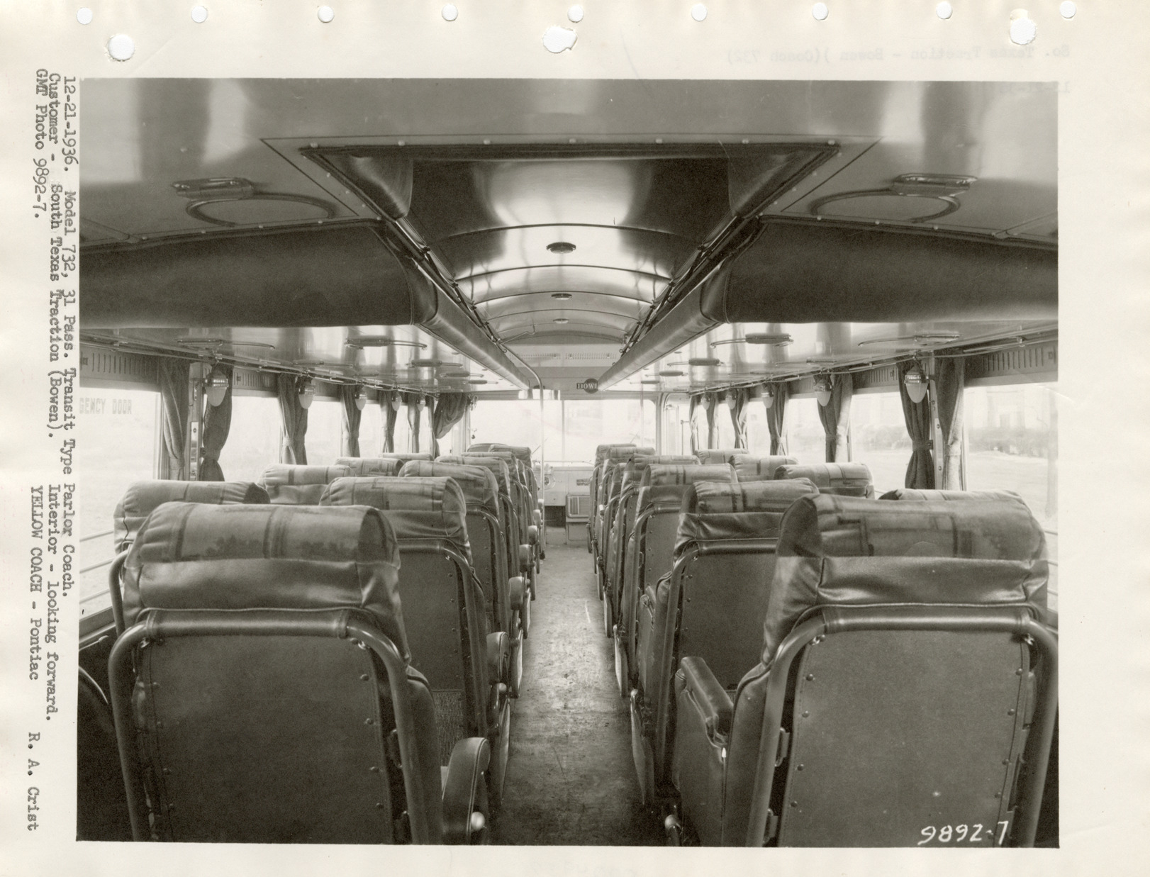 Interior view of a Yellow Truck and Coach bus for Bowen Motor Coaches, showing seats. Typed on front: "12-21-1936. Model 732, 31 pass. Transit type parlor coach. Customer - South Texas Traction (Bowen). Interior, looking forward. GMT photo 9892-7. Yellow Coach, Pontiac. R.A. Crist." Typed on back: "So. Texas Traction, Bowen (Coach 732). 12-21-36."
