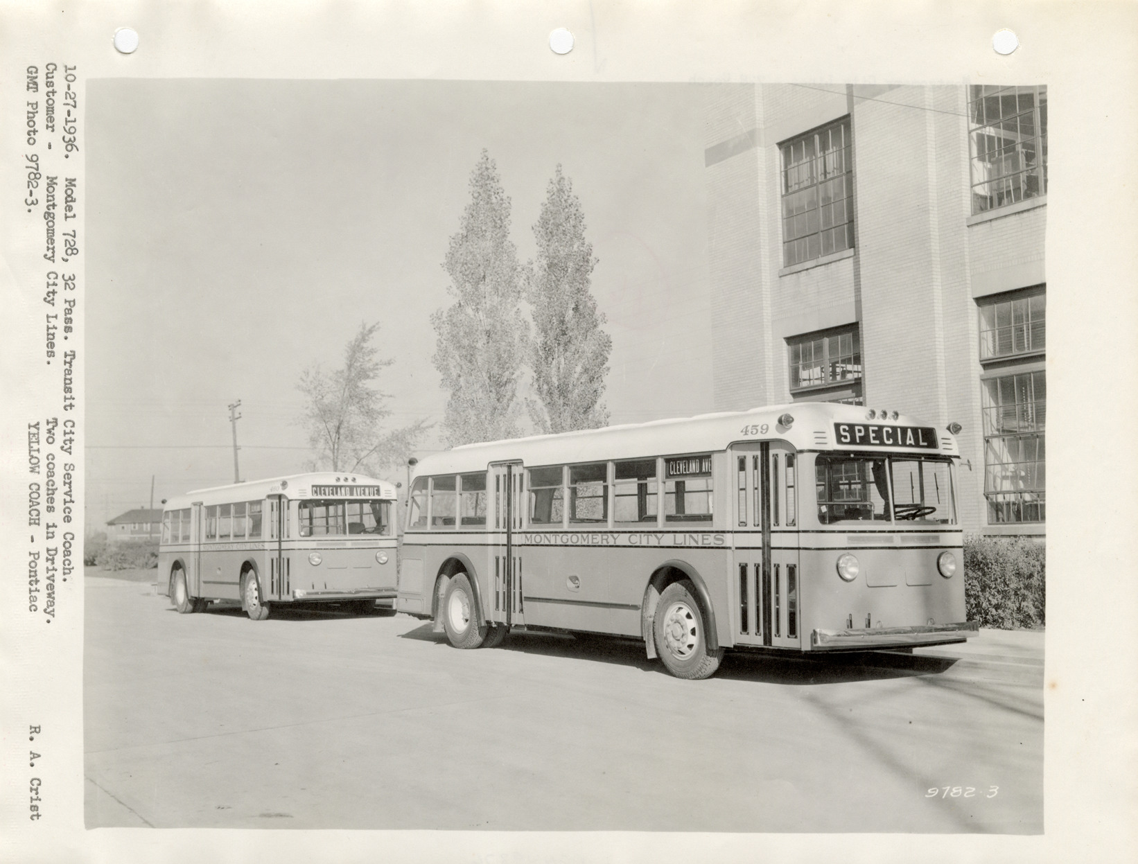 View of two Yellow Truck and Coach buses for the Montgomery City Lines. Typed on front: "10-27-1936. Model 728, 32 pass. Transit city service coach. Customer - Montgomery City Lines. Two coaches in driveway. GMT photo 9782-3. Yellow Coach, Pontiac. R.A. Crist." Typed on back: "Montgomery City Lines. 728 coach. 10-27-36."