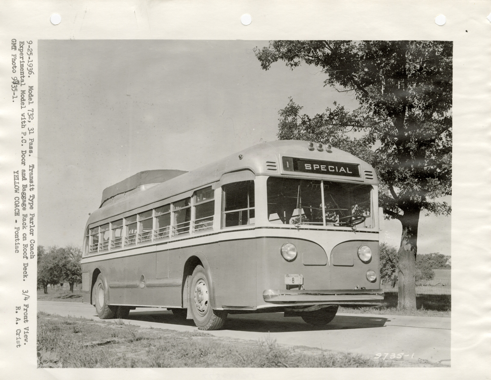 View of a Yellow Truck and Coach bus. Typed on front: "9-25-1936. Model 732, 31 pass. Transit type parlor coach. Experimental model with P.C. door and baggage rack on roof deck. 3/4 front view. GMT photo 9735-1. Yellow Coach, Pontiac. R.A. Crist." Typed on back: "Coach, 732, 3/4 front, see 9743. 9-25-36."