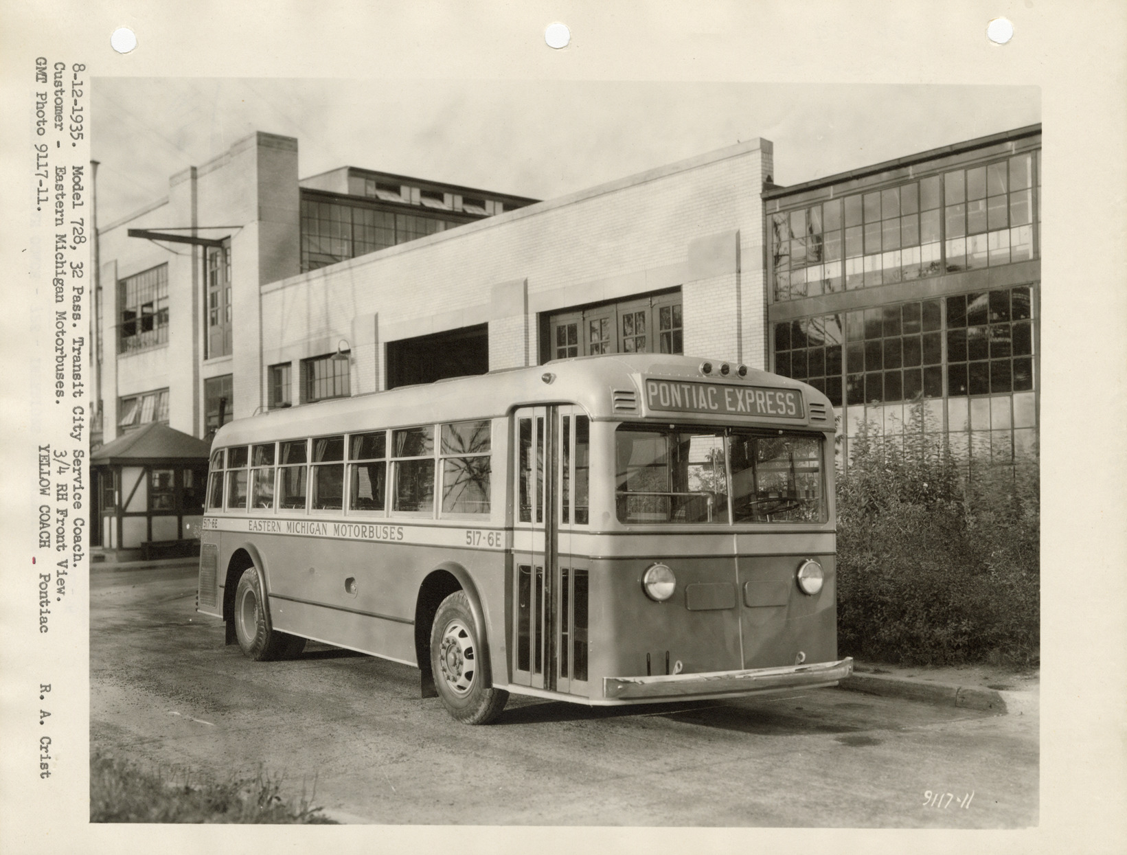 View of a Yellow Truck and Coach bus for Eastern Michigan Motorbuses. Typed on front: "8-12-1935. Model 728, 32 pass. Transit city service coach. Customer, Eastern Michigan Motorbuses. 3/4 RH front view. GMT photo 9117-11. Yellow Coach, Pontiac. R.A. Crist." Typed on back: "Eastern Michigan Coach, 728, interiors and exteriors, 8-12-35."