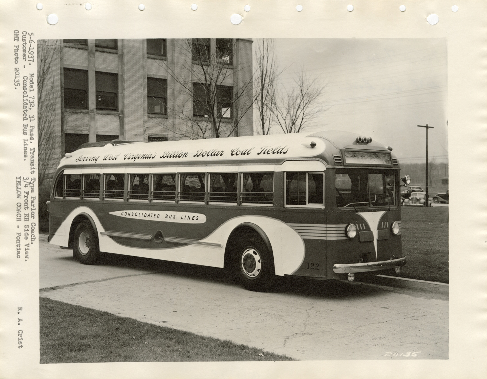 View of a Yellow Truck and Coach bus for the Consolidated Bus Lines. Typed on front: "5-6-1937. Model 732, 31 pass. Transit type parlor coach. Customer, Consolidated Bus Lines. 3/4 front RH side view. GMT photo 20135. Yellow Coach, Pontiac. R.A. Crist."