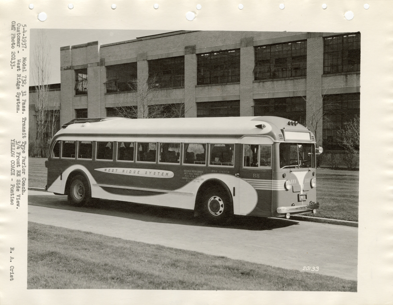 Favorite this☆ Yellow Truck and Coach bus, West Ridge System Description: View of a Yellow Truck and Coach bus for the West Ridge System. Typed on front: "5-4-1937. Model 732, 31 pass. Transit type parlor coach. Customer, West Ridge System. 3/4 front RH side view. GMT photo 20133. Yellow Coach, Pontiac. R.A. Crist." Details Resource ID: na049390 Creator: Crist, R.A. Subject: Buses Yellow Truck and Coach Manufacturing Company General Motors Truck Company Photographic prints Date Issued: 1937-05-04 Format: 1 photographic print ; 8.5 x 11 in. Member of: National Automotive History Collection Filing Location: MS121/VanDegrift, Thomas, 16:4 Rights: Physical rights are retained by DPL. Copyright is retained in accordance with U.S. copyright laws.