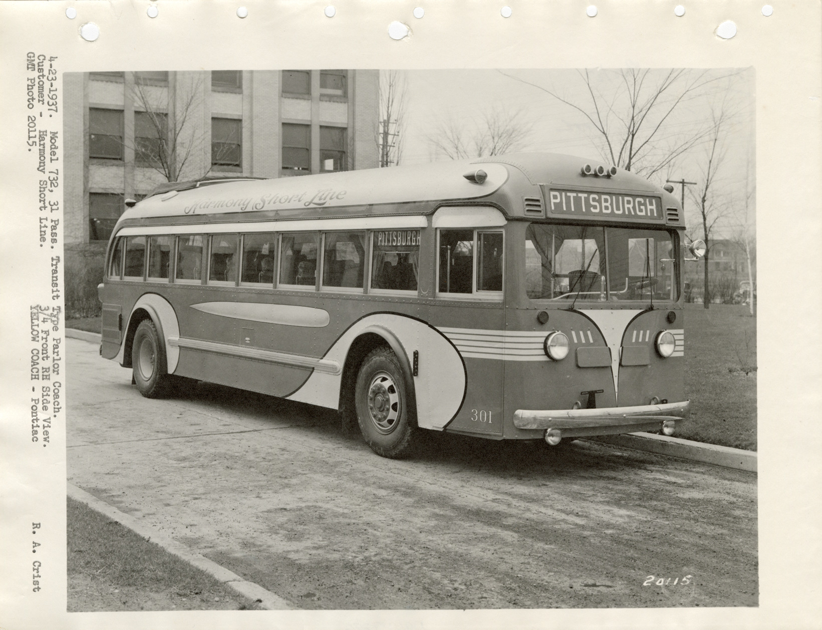 Favorite this☆ Yellow Truck and Coach bus, Harmony Short Line Description: View of a Yellow Truck and Coach bus for the Harmony Short Line. Typed on front: "4-23-1937. Model 732, 31 pass. Transit type parlor coach. Customer, Harmony Short Line. 3/4 front RH side view. GMT photo 20115. Yellow Coach, Pontiac. R.A. Crist." Details Resource ID: na049396 Creator: Crist, R.A. Subject: Buses Yellow Truck and Coach Manufacturing Company General Motors Truck Company Photographic prints Date Issued: 1937-04-23 Format: 1 photographic print ; 8.5 x 11 in. Member of: National Automotive History Collection Filing Location: MS121/VanDegrift, Thomas, 16:4 Rights: Physical rights are retained by DPL. Copyright is retained in accordance with U.S. copyright laws.