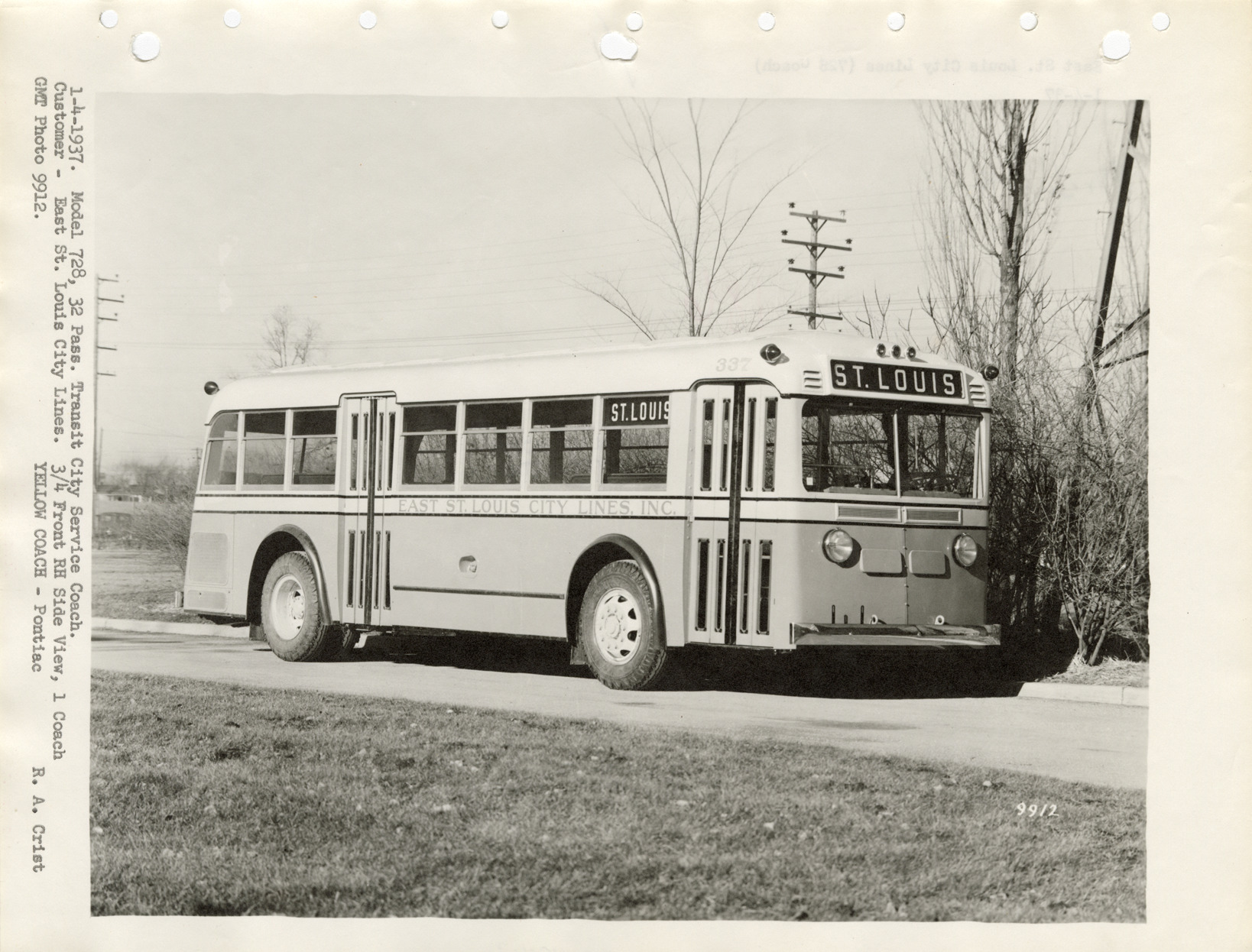 View of a Yellow Truck and Coach bus for the East St. Louis City Lines. Typed on front: "1-4-1937. Model 728, 32 pass. Transit city service coach. Customer, East St. Louis City Lines. 3/4 front RH side view, 1 coach. GMT photo 9912. Yellow Coach, Pontiac. R.A. Crist." Typed on back: "East St. Louis City Lines (728 coach), 1-4-37."