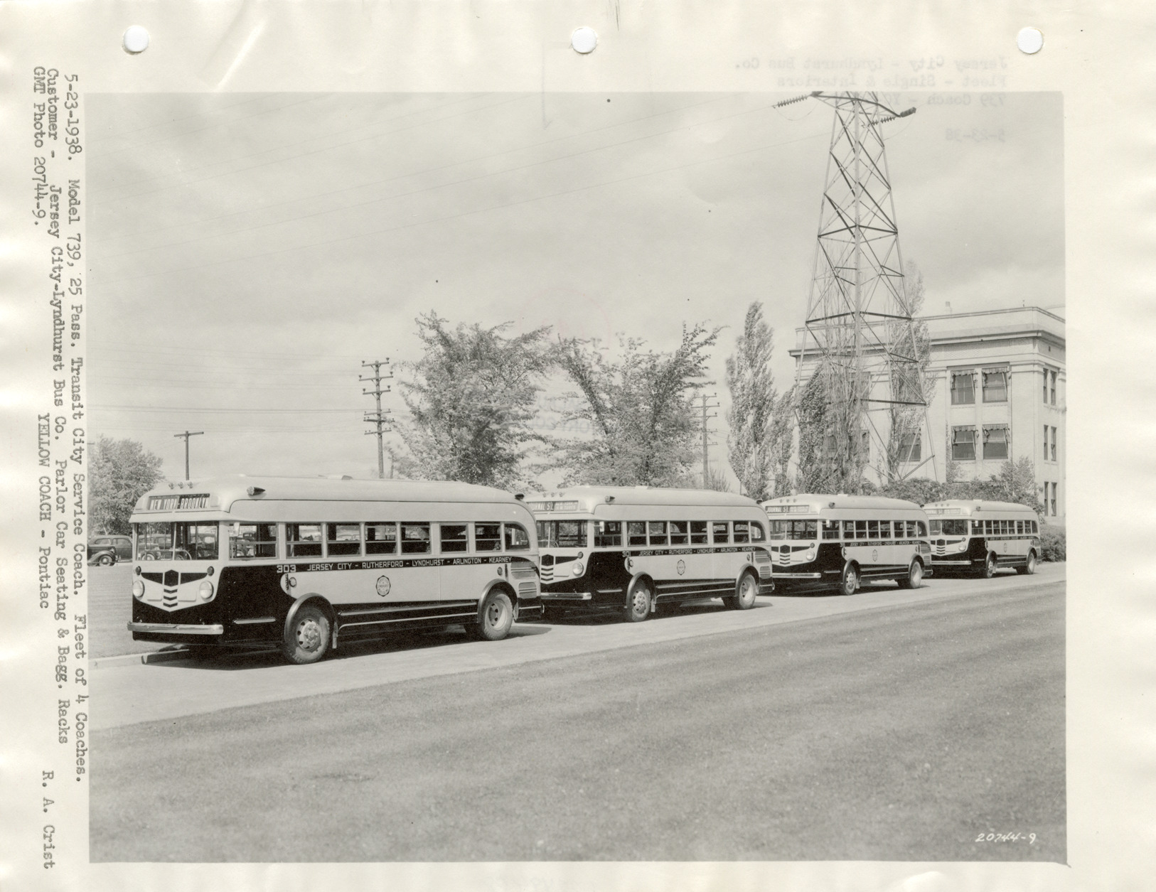 View of four Yellow Truck and Coach buses for the Jersey City-Lyndhurst Bus Co. Typed on front: "5-23-38. Model 739, 25 pass. Transit city service coach. Fleet of 4 coaches. Customer, Jersey City-Lyndhurst Bus Co. Parlor car seating & bagg. racks. GMT photo 20744-9. Yellow Coach, Pontiac. R.A. Crist." Typed on back: "Jersey City-Lyndhurst Bus Co. Fleet, single & interiors. 739 coach, YC-85602. 5-23-38."